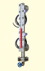 控製型是在翻柱液位計的基礎上增加了磁控開關,在監測液位的同時磁控開關信號可用於對液位進行控製或報警;遠傳型是在翻柱液位計的基礎上增加了 4~20mA 變送傳感器,在現場監測液位的同時將液位的變化通過變送傳感器、線纜及儀表傳到控製室,實現遠程監測和控製。