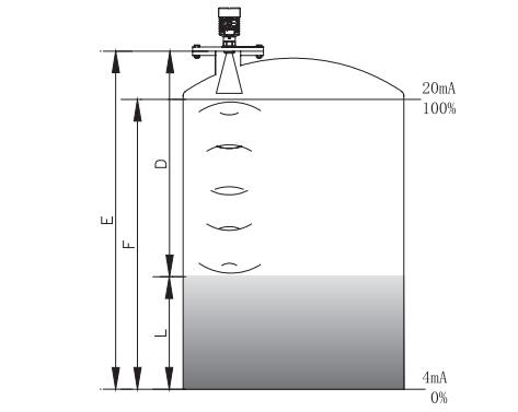 通過輸入空罐高度E(=零點),滿罐高度F(=滿量程)及一些應用參數來設定,應用參數將自動使儀表適應測量環境。對應於4~20mA輸出。