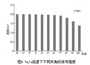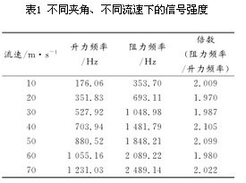 通過仿真模擬,圖4給出流速u=5m/s時,作用在三角柱上的升力係數和阻力係數變化曲線。由圖5升力係數的FFT曲線可以看出其頻率為FL=87.92Hz。從圖6阻力係數的FFT曲線可以看出其頻率為FD=176.43Hz,約為升力係數變化頻率的2倍。 為了驗證將FLUENT用於渦街流量計的三維流場仿真的可行性,對不同流速下的升、阻力頻率進行比較,如表1所示。可以看出阻力係數變化頻率是升力係數變化頻率的2倍,說明用FLUENT進行渦街流量計的三維仿真是可行的。 4 仿真結果 基於上述通過升、阻力變化頻率的關係驗證出利用FLUENT對三維渦街流場進行仿真是可行的。本節應用FLUENT對截流夾角、流速和信號強度之間的關係進行了仿真研究。分別取7m/s、40m/s和70m/s的流速α的角度在0°~10°範圍內取值(發生體的安裝偏差一般不會超過10°),進行數值仿真。記錄信號強度,如表2所示。 將表2的數據繪製成圖7,將圖7中流速為7m/s的數據放大如圖8所示。觀察圖7、8,可以直觀的反應出夾角、流速與信號強度的關係變化。通過對比這3張圖可以看出,信號強度隨著夾角、流速的不同而不同。並從圖中得出結論: 1)渦街的信號強度與流速成正比,隨著流速的增加,旋渦脫落頻率信號強度會顯著增加。 2)在流速相同的情況下,隨著夾角的增大,信號強度逐漸減小,並隨著夾角的增大,信號強度的衰減程度也逐漸增大。夾角在1°~7°範圍,對信號強度的衰減影響不大,可忽略,超過7°以後對信號強度影響變大,不可忽略。 3)在夾角相同的情況下,隨著流速的增大,信號強度衰減趨勢越來越明顯。 5 結論 liuchangfangzhenzaiwojieliuliangjideshejihewanshanzhongzhengbiandeyuelaiyuezhongyao,tatongguolilunzhichizhidaofangzhendekeshishixing,bingjiangfangzhenjielunyongyushiyanzhong,tigaoxiaolv。tongguomonisanweiwojieliuchangsanjiaozhuraoliuxianxiang,jiangsheng、阻力頻率進行對比,驗證了可將FLUENT用於三維渦街流場的仿真中。並從不同流速和不同截流夾角兩方麵分別考慮,對比分析了三維渦街信號的信號強度,得出夾角在1°~7°範圍,對信號強度的影響不大,超過了7°以yi後hou影ying響xiang變bian大da。從cong而er為wei以yi後hou的de實shi驗yan做zuo出chu理li論lun指zhi導dao。進jin一yi步bu的de研yan究jiu可ke以yi通tong過guo對dui不bu同tong形xing狀zhuang的de旋xuan渦wo發fa生sheng體ti取qu不bu同tong截jie流liu夾jia角jiao和he不bu同tong流liu速su進jin行xing仿fang真zhen對dui比bi研yan究jiu。
