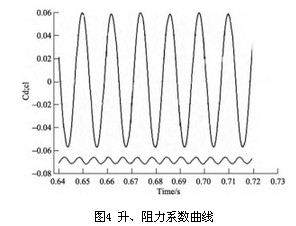3.2 仿真參數設置 在FLUENT中,三維渦街流場參數設置如下: 1)流體:空氣(air); 2)湍流模型:Renormalization-group(RNG)k-ε模型; 3)邊界條件 ①流速入口邊界:根據需要設置不同流速、湍流動能和耗散率; ②壓力出口邊界:零壓; 4)求解器:基於壓力的三維雙精度瞬態求解器; 5)數值計算過程:SIMPLE算法。 3.3 升、阻力變化頻率的計算結果及分析 圖3所示速度等值。三維渦街流場在夾角為0°,入口流速為5m/s的情況下的速度等值線圖。