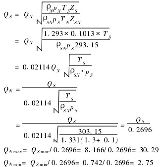 式中:ZS(ZSN)為被測氣體在標準狀態(工作狀態)下壓縮係數(一般情況ZSUZSN);QS為工況下氧氣的實際流量;QN為標況下空氣的實際流量;QN為標況下空氣的密度(11293kg/m3);pN為標準大氣壓;TN為標準溫度293115K;QSN為標況下氧氣的密度(即Q20);pS為氧氣實際工作壓力(即p1);TS為氧氣實際工作溫度(即T1)。