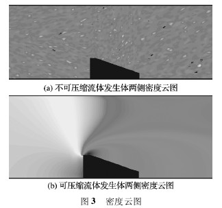 根據公式 ( 1) 可知,影響渦街流量計旋渦頻率的是發生體兩側的流速 U1和發生體的結構,由於發生體結構尺寸是固定的,因此頻率隻與 U1相關,需要觀測在相同入口流速 U 的條件下 U1bianhualaidedaopinlvdebianhua,ersududebianhuabiranhuidaozhiliutimidudebianhua,yincikeguancefashengtiliangcedemiduyuntu,laipanduankeyasuoxingduiwojieliuliangjiliusu U1的影響,通過仿真得到如圖 3 ( a) 所示的不可壓縮流體發生體兩側的密度雲圖和如圖 3 ( b) 所示的可壓縮流體發生體兩側的密度雲圖。