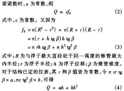 式中:Q為體積流量;a為流出係數;人為浮子最大直徑與其同高度錐管橫截麵之間的環隙麵積;g為重力加速度;玲為浮子的體積;Pf為浮子的密度;P為被測流體的密度;A為浮子的最大截麵積。