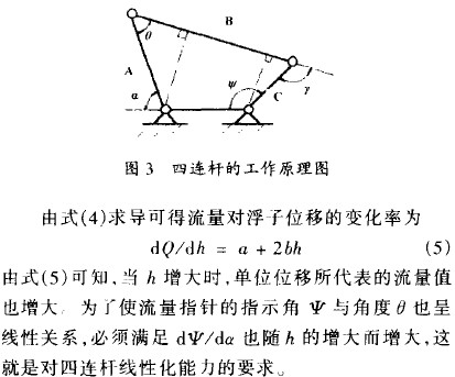 產生位移,浮子的位移通過磁鋼4、5的禍合傳給平衡杆6。此時,位移和流量的關係為非線性,必須通過連杆8、9、10進行線性化才能使指針11有線性流量指標。四連杆的工作原理如圖3所示。