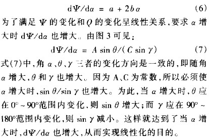 連杆8、9、10的長度分別為A、B、C,連杆8與平衡杆6固定在一起,指針與連杆ro固定在一起。要求轉角少的變化和流量Q的變化呈線性關係,這樣可用d空代替d口,用da代替d人,代人公式(5)得