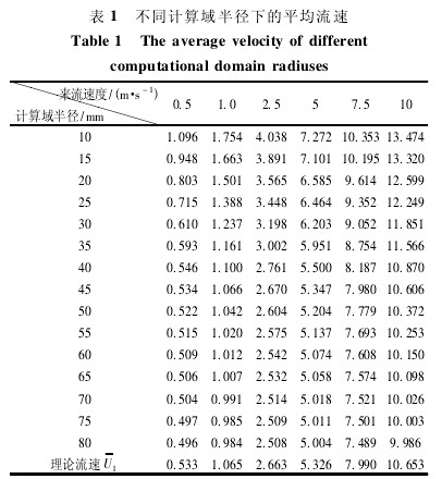 取計算域半徑在 10 ~ 80 mm 的範圍內,通過GAMBIT 軟件分別建立模型,再由 FLUENT 軟件分別進行仿真,得出在不同半徑的計算域內所對應的體積加權平均流速,如表 1 所示。