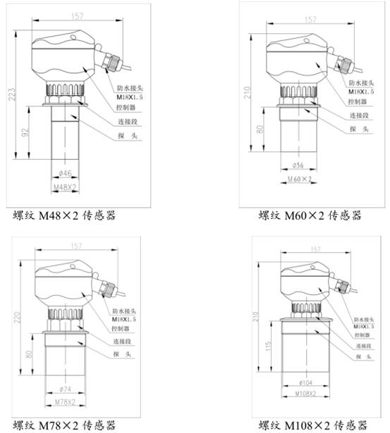 超聲波液位計可采用二線製、三線製或四線製技術,供電回路和信號輸出回路獨立,當采用直流24v供電時,可使用一根3芯電纜線,供電負端和信號輸出負端共用一根芯線;當采用交流220v供電時,或者當采用直流24v供電,要求供電回路與信號輸出回路完全隔離時,應使用一根4芯電纜線。直流或交流供電,具有4~20mADC,高低位開關量輸出。 超聲波液位計應用: 1、測量流量、液位、低表壓、真空和比重 2、兩線製最大量程可達30m 3、四線製最大量程可達40m 4、最小分辨率1mm 5、LCD/LED大顯示屏 6、智能信號處理技術 7、配有高低位雙繼電器(僅四線製) 8、全塑料防腐外殼(防護等級lP67) 9、換能器結構(小量程物位計法蘭安裝時,對法蘭接管長度無要求) 10、簡單的按鍵設定參數(無需等待容器排空或加滿,無需附加的遙控器) 11、靈活的安裝方式(螺紋/法蘭、固定孔/支架) 螺紋尺寸:M48*2 M60*2 超聲波液位計技術參數
