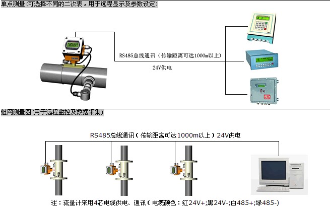 一次表與二次表(或計算機)之間采用RS-485總線通訊,采用普通電纜即可,傳輸距離可達1000米以上,組網十分方便、快捷。這種傳輸方式抗幹擾能力佳,解決了分體式超聲波流量計專用電纜成本高、抗幹擾能力差、傳輸距離短等問題。