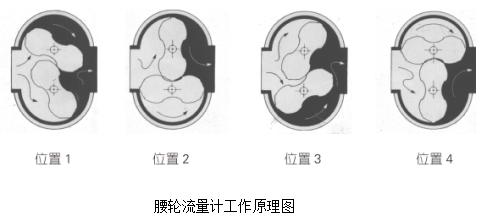 智能氣體腰輪(羅茨)流量計,主要由殼體、共軛轉子、計數器和智能流量轉換器等部件構成。裝於計量室內的一對共軛轉子在流通氣體的出入口壓差(P入>P出)作用下,通過精密加工的調校齒輪使轉子保持正確的相對位置。轉子間、轉子與殼體、轉(zhuan)子(zi)與(yu)牆(qiang)板(ban)間(jian)保(bao)持(chi)最(zui)佳(jia)工(gong)作(zuo)間(jian)隙(xi),實(shi)現(xian)了(le)連(lian)續(xu)的(de)無(wu)接(jie)觸(chu)密(mi)封(feng)。轉(zhuan)子(zi)每(mei)轉(zhuan)動(dong)一(yi)周(zhou),則(ze)輸(shu)出(chu)四(si)倍(bei)計(ji)量(liang)室(shi)有(you)效(xiao)容(rong)積(ji)的(de)氣(qi)體(ti),轉(zhuan)子(zi)的(de)轉(zhuan)數(shu)通(tong)過(guo)磁(ci)性(xing)密(mi)封(feng)聯(lian)軸(zhou)裝(zhuang)置(zhi)及(ji)減(jian)速(su)機(ji)構(gou),傳(chuan)遞(di)到(dao)智(zhi)能(neng)流(liu)量(liang)轉(zhuan)換(huan)器(qi),從(cong)而(er)顯(xian)示(shi)輸(shu)出(chu)氣(qi)體(ti)的(de)累(lei)計(ji)體(ti)積(ji)量(liang)。其(qi)計(ji)量(liang)過(guo)程(cheng)和(he)工(gong)作(zuo)原(yuan)理(li)如(ru)圖(tu)所(suo)示(shi)(圖中僅表示了四分之一周期)。