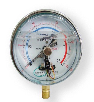 在(zai)電(dian)接(jie)點(dian)壓(ya)力(li)表(biao)裝(zhuang)置(zhi)的(de)電(dian)接(jie)觸(chu)信(xin)號(hao)針(zhen)上(shang),裝(zhuang)有(you)可(ke)調(tiao)節(jie)的(de)永(yong)久(jiu)磁(ci)鋼(gang),可(ke)以(yi)增(zeng)加(jia)接(jie)點(dian)吸(xi)力(li),加(jia)快(kuai)接(jie)觸(chu)動(dong)作(zuo),從(cong)而(er)使(shi)觸(chu)點(dian)接(jie)觸(chu)可(ke)靠(kao),消(xiao)除(chu)電(dian)弧(hu),能(neng)有(you)效(xiao)的(de)避(bi)免(mian)儀(yi)表(biao)由(you)於(yu)工(gong)作(zuo)環(huan)境(jing)振(zhen)動(dong)或(huo)介(jie)質(zhi)壓(ya)力(li)脈(mai)動(dong)造(zao)成(cheng)觸(chu)點(dian)的(de)頻(pin)繁(fan)關(guan)斷(duan)。所(suo)以(yi)電(dian)接(jie)點(dian)壓(ya)力(li)表(biao)具(ju)有(you)動(dong)作(zuo)可(ke)靠(kao)、使用壽命長、觸點開關功率較大等優點。