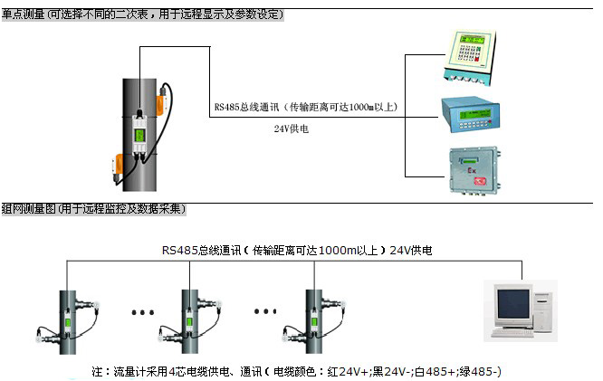 一次表與二次表(或計算機)之間采用RS-485總線通訊,采用普通電纜即可,傳輸距離可達1000米以上,組網十分方便、快捷。這種傳輸方式抗幹擾能力好,解決了分體式超聲波流量計專用電纜成本高、抗幹擾能力差、傳輸距離短等問題。