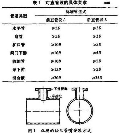 流體在方向、guanjingyijifamenkaidubianhuashi,huichanshengwoliuheliuchangjibian,zheyanghuiduichuanganqidianjideceliangchanshengyingxiang,congeryingxiangyibiaodejingdu。suoyiyaojinkenengdilikaiwanguan、手閥、調節閥等部件一定距離,直管段的具體要求見表l。表中,D表示管道通徑,L表示傳感器到閥門或彎頭等部件的距離。