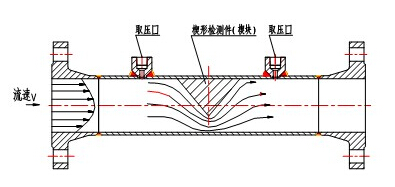 一體化智能型楔形流量計流量傳感器的檢測件是楔形孔板,它是一塊V形節流件,它的圓形頂角朝下,這樣有利於含懸浮顆粒(粉塵、泥沙及其它固體顆粒)流體和高粘度液體流過時在節流件上遊側不會產生滯流,也不會在節流體上、下遊側發生固體顆粒或粘稠物的積存,從而確保楔形流量傳感器長期運行穩定性:±0.1FS%Y,這樣高的長期運行精度在流量測量領域是迄今少見的。楔形流量傳感器的結構如圖1所示。