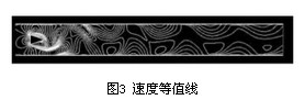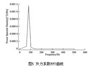 3.2 仿真參數設置 在FLUENT中,三維渦街流場參數設置如下: 1)流體:空氣(air); 2)湍流模型:Renormalization-group(RNG)k-ε模型; 3)邊界條件 ①流速入口邊界:根據需要設置不同流速、湍流動能和耗散率; ②壓力出口邊界:零壓; 4)求解器:基於壓力的三維雙精度瞬態求解器; 5)數值計算過程:SIMPLE算法。 3.3 升、阻力變化頻率的計算結果及分析 圖3所示速度等值。三維渦街流場在夾角為0°,入口流速為5m/s的情況下的速度等值線圖。