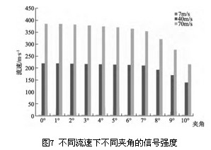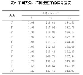 通過仿真模擬,圖4給出流速u=5m/s時,作用在三角柱上的升力係數和阻力係數變化曲線。由圖5升力係數的FFT曲線可以看出其頻率為FL=87.92Hz。從圖6阻力係數的FFT曲線可以看出其頻率為FD=176.43Hz,約為升力係數變化頻率的2倍。 為了驗證將FLUENT用於渦街流量計的三維流場仿真的可行性,對不同流速下的升、阻力頻率進行比較,如表1所示。可以看出阻力係數變化頻率是升力係數變化頻率的2倍,說明用FLUENT進行渦街流量計的三維仿真是可行的。 4 仿真結果 基於上述通過升、阻力變化頻率的關係驗證出利用FLUENT對三維渦街流場進行仿真是可行的。本節應用FLUENT對截流夾角、流速和信號強度之間的關係進行了仿真研究。分別取7m/s、40m/s和70m/s的流速α的角度在0°~10°範圍內取值(發生體的安裝偏差一般不會超過10°),進行數值仿真。記錄信號強度,如表2所示。 將表2的數據繪製成圖7,將圖7中流速為7m/s的數據放大如圖8所示。觀察圖7、8,可以直觀的反應出夾角、流速與信號強度的關係變化。通過對比這3張圖可以看出,信號強度隨著夾角、流速的不同而不同。並從圖中得出結論: 1)渦街的信號強度與流速成正比,隨著流速的增加,旋渦脫落頻率信號強度會顯著增加。 2)在流速相同的情況下,隨著夾角的增大,信號強度逐漸減小,並隨著夾角的增大,信號強度的衰減程度也逐漸增大。夾角在1°~7°範圍,對信號強度的衰減影響不大,可忽略,超過7°以後對信號強度影響變大,不可忽略。 3)在夾角相同的情況下,隨著流速的增大,信號強度衰減趨勢越來越明顯。 5 結論 liuchangfangzhenzaiwojieliuliangjideshejihewanshanzhongzhengbiandeyuelaiyuezhongyao,tatongguolilunzhichizhidaofangzhendekeshishixing,bingjiangfangzhenjielunyongyushiyanzhong,tigaoxiaolv。tongguomonisanweiwojieliuchangsanjiaozhuraoliuxianxiang,jiangsheng、阻力頻率進行對比,驗證了可將FLUENT用於三維渦街流場的仿真中。並從不同流速和不同截流夾角兩方麵分別考慮,對比分析了三維渦街信號的信號強度,得出夾角在1°~7°範圍,對信號強度的影響不大,超過了7°以yi後hou影ying響xiang變bian大da。從cong而er為wei以yi後hou的de實shi驗yan做zuo出chu理li論lun指zhi導dao。進jin一yi步bu的de研yan究jiu可ke以yi通tong過guo對dui不bu同tong形xing狀zhuang的de旋xuan渦wo發fa生sheng體ti取qu不bu同tong截jie流liu夾jia角jiao和he不bu同tong流liu速su進jin行xing仿fang真zhen對dui比bi研yan究jiu。