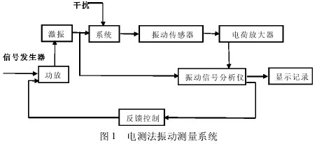 根gen據ju上shang述shu內nei容rong可ke知zhi,本ben文wen振zhen動dong測ce量liang係xi統tong研yan究jiu中zhong采cai用yong的de是shi電dian測ce法fa,這zhe是shi振zhen動dong測ce量liang中zhong常chang用yong方fang法fa,與yu光guang測ce法fa和he機ji械xie法fa比bi較jiao而er言yan,該gai方fang法fa具ju有you使shi用yong頻pin率lv範fan圍wei寬kuan,動dong態tai範fan圍wei廣guang,測ce量liang靈ling敏min度du高gao等deng優you勢shi,而er且qie電dian測ce法fa能neng夠gou適shi用yong於yu不bu同tong的de測ce振zhen傳chuan感gan器qi,而er信xin號hao也ye便bian於yu被bei記ji錄lu、處理和傳送。由此,本文中的振動測量係統主要由:振動傳感器、電荷放大器、信號分析儀等構成,如圖1所示。