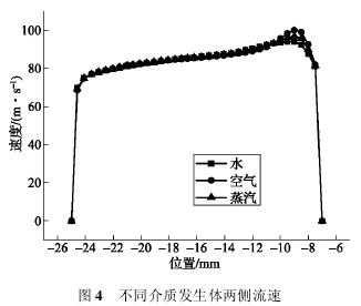 根據圖 3 得到的結論,對渦街流量計進行蒸汽、空氣和水三種介質下的軟件仿真,設置三種介質的入口流速均為 50 m/s,取渦街發生體迎流麵側棱中點與管壁連線,如圖 2 中線段 ab所示。取該線上的速度值,將蒸汽、空氣和水三種介質下的速度曲線進行比較,結果如圖 4所示。