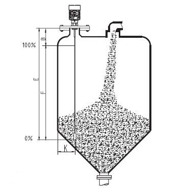 通過輸入空罐高度E(=零點),滿罐高度F(=滿量程)及一些應用參數來設定,應用參數將自動使儀表適應測量環境。對應於4~20mA輸出。