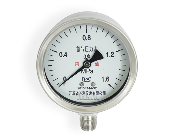 氮氣壓力表適用於測量密閉容器或者管道內氮氣介質的壓力的場合,氮氣壓力表由導壓係統、齒輪傳動機構、示數裝置、和外殼所組成。外殼為氣密性結構,能有效的保護內部機件免受環境影響。