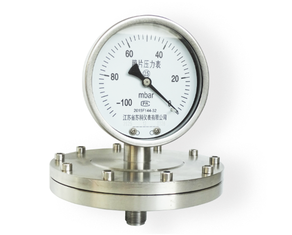 膜片壓力表由測量係統(包括法蘭接頭、波紋膜片)、傳動指示機構(包括連杆、齒輪傳動機構、指針和度盤)和外殼(包括表殼和罩圈)等組成。膜片壓力表外殼為防濺結構,具有較好的密性,故能保護其內部機構免受汙穢浸入。